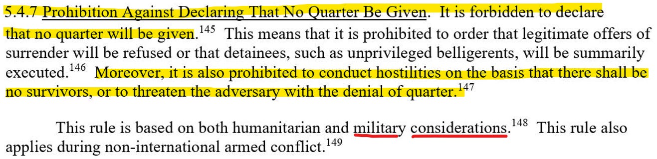 Denial of quarter is such a grave breach that it occupies the very short list of things the whole world agrees are legally verboten, whether they are committed by a country that agreed to them or not. It is unlawful no matter the type of conflict, even if it’s against a non-state actor. We prosecuted Nazis at Nuremberg for refusing quarter.